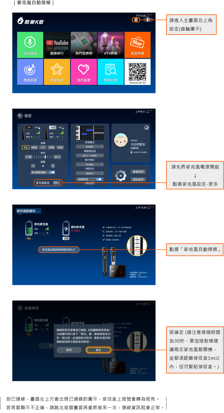 1.先退出到設定畫面,再重新進 入第三步驟麥克風圖案,確認 是否顯示 兩支麥克風都連線。